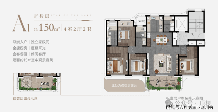 •户户空中庭院,栋栋架空层;露台超6米挑高,赠送面积约15㎡-35㎡,约270°弧形转角露台(部分户型),环幕视野,尽揽太湖浩瀚风光。