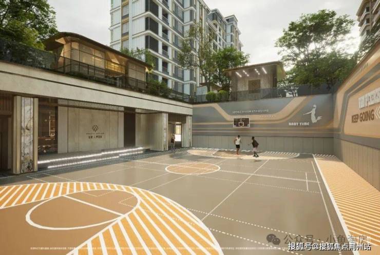 🏀 下沉式运动场,篮球、羽毛球、排球三合一,与全龄健身花园交织,动静分区,满足家庭多元运动需求,赋予生活鲜活的松弛感。