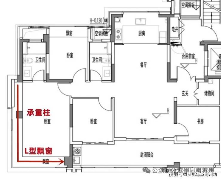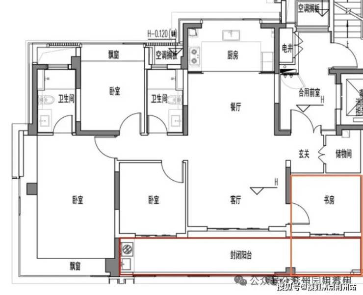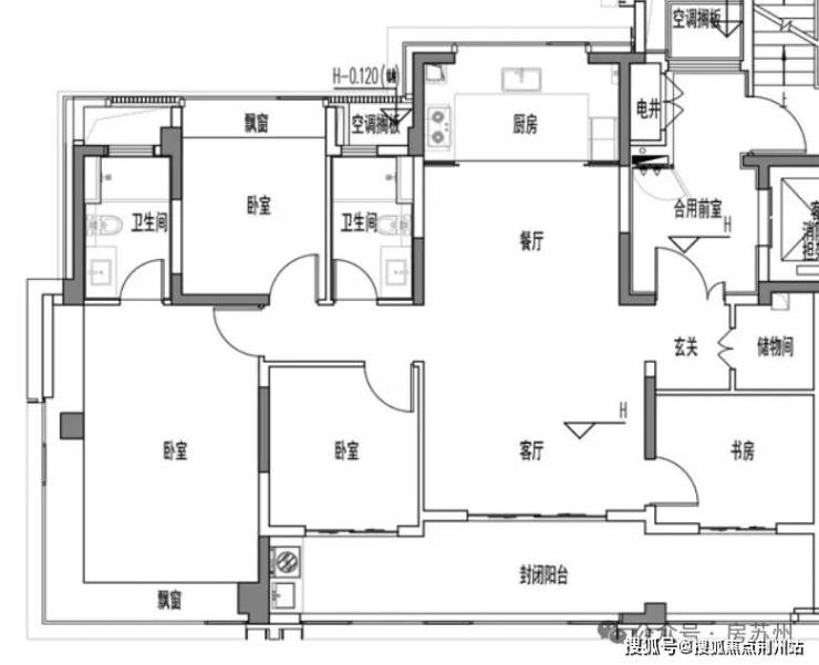 建面约178m²卫,和约143㎡一样,约178㎡户型也是做了三阳台,朝南次套房可以与阳台打通,增加进深。