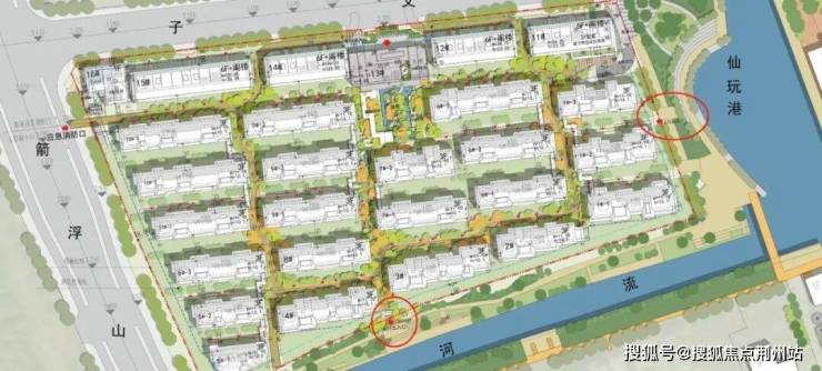 二,绿城比较擅长让园区与外部景观产生互动,所以社区的南侧和东侧分别设立了人行出入口,这有利于业主比较方便的出入。尤其东侧,与仙玩港的互动就更强了。