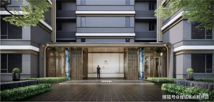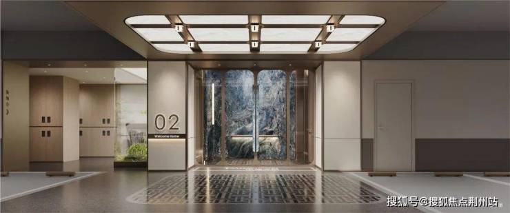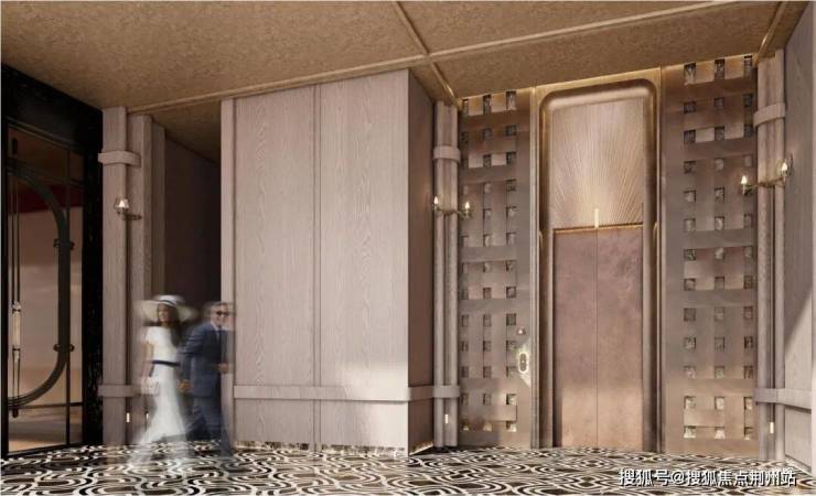 双臻装入户大堂,将尊崇延伸至每一条动线。地上单元门楼以法国木纹石材为基,景泰蓝石材作缀,铝板与金属格栅交织出细腻的光影