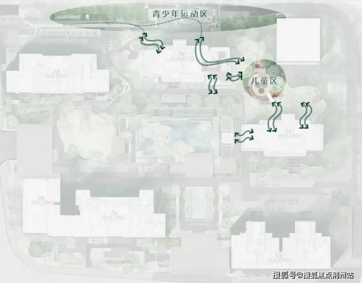 室内外无界渗透,青少年运动场、宅间花园、儿童乐园与架空层的无界联动体系,打造无界交流共享空间 , 弱化交界面,室内外共享 , 形成园区功能互通;从儿童到青少年到成年人的全龄无界互通