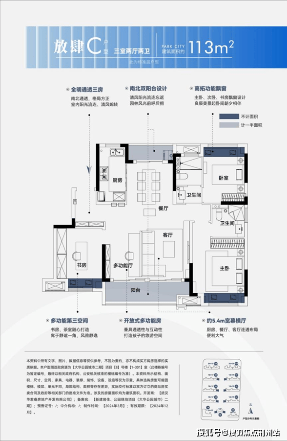 以113㎡户型为例,约5.4米的宽幕横厅,带来震撼的视野与通透的采光效果。南北双阳台、3飘窗,,不仅增强了空间感,更增添观景的乐趣。室内得房率约90%,是不可多得的首改理想之选。