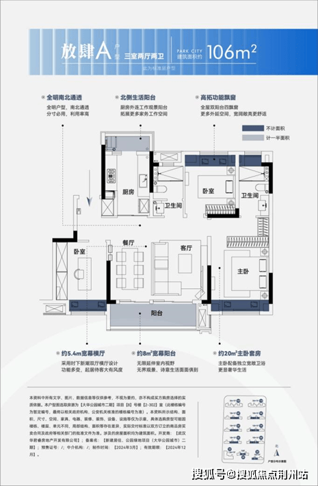 以106㎡户型为例,约11.6m的南向大开间,搭载约5.4m宽幕横厅,让整个空间拥有更好的视野与采光。全屋双阳台、四飘窗的高拓展功能,让空间感更强,足以媲美市场上约120㎡户型才有的舒适性和功能性。