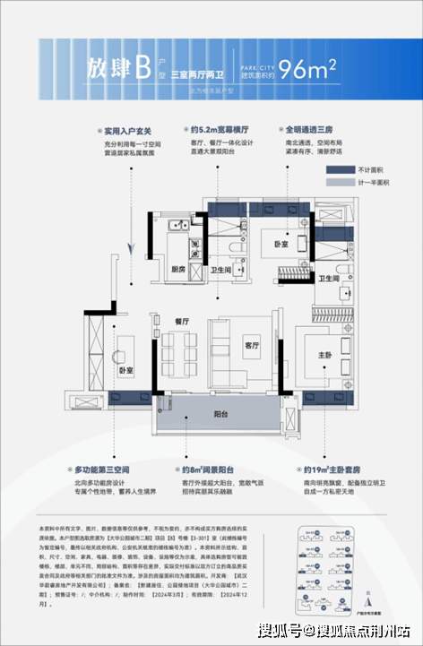 以建面约96平小三房为例,该户型实际使用面积相当于市面上110平以上户型,花小三房的钱买到大三房。通过优化框架设计,室内空间更加灵活多变,“大横厅”、“跑道式阳台”等空间体验也能轻松做到。