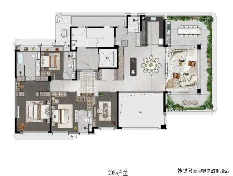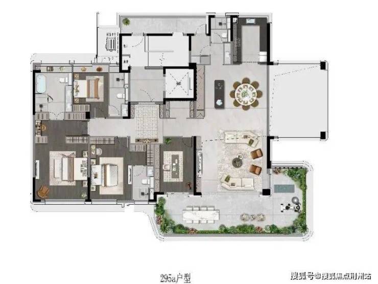 【别墅体验】:通过巨大的赠送露台和端厅设计,实现了别墅才有的庭院生活感和空间尺度,但居于城市核心的高点,视野更为壮阔。