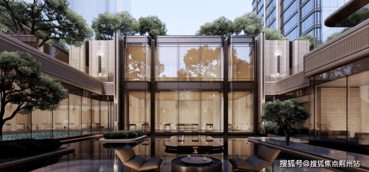 江屿镜庭以“江中有岛、岛中有湖”的江心屿为设计灵感,整个景观以温州首个单侧悬挑风雨连廊串通,透光云石、乱纹古铜金铝板在光影交织中勾勒出空间的奢华质感与匠心精神。