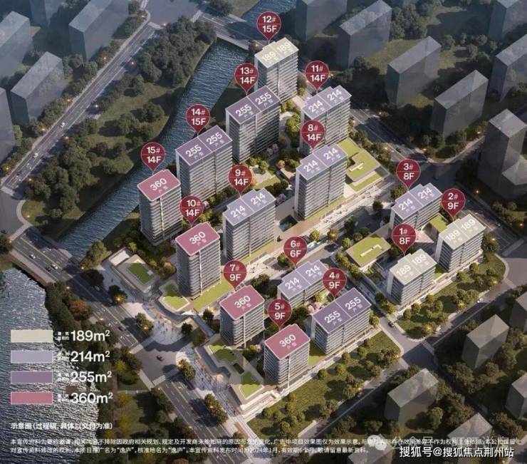 小区一共有15幢,由洋房和小高层组成。面积为189㎡、214㎡、255㎡和360㎡。