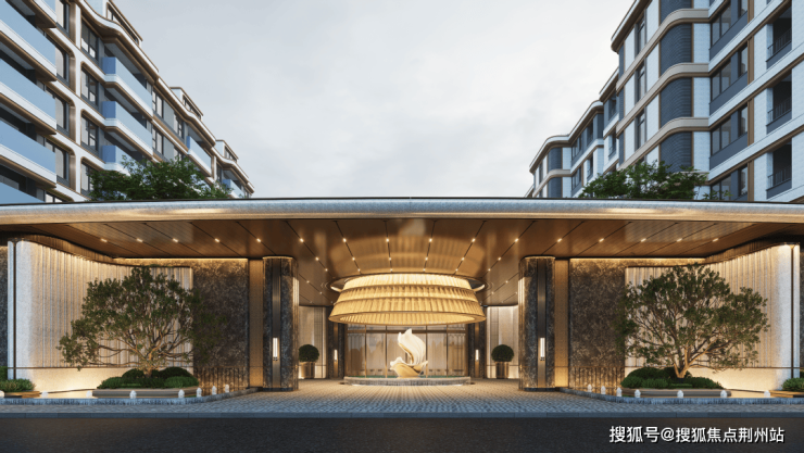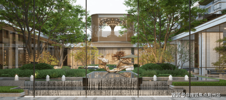 社区主入口位于地块西侧,以大尺度门头与两侧延展面凸显整体形象界面的品质感。内部三进空间,以中央雕塑与艺术装置形成中岛,配合大面积石材与地面铺装、金属格栅与线条运用凸显品质感。会所区域围合的景观庭院以精致闲适风格为主,景观游廊与林下休憩空间,水景小品与微地形高差处理形成的功能分区,细节丰富。