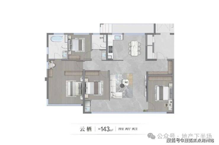 建面约143平四室两厅两卫则打破了“大视野只属于客厅”的惯例。主卧创新呈现了270°转角落地窗,这种以往仅见于200㎡以上客厅的环幕视野,如今在143㎡户型中得以实现。放眼当下济南同面积段产品,能有如此出众赏景体验的,实属少见。