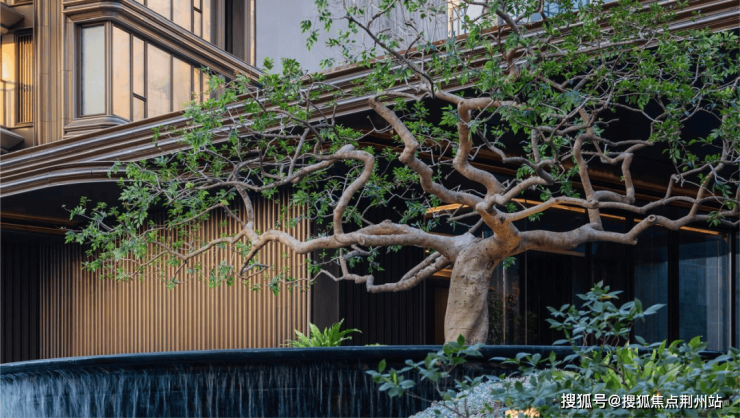 而实景首开的近2000㎡下沉庭院,作为“园林灵魂”,漫步此间,你会看见:乌金原石围合的“玉扣绿岛”上,低调静放着团队自“天下玉源”河南南阳历时遴选而来,近7000年的“国玉”独山璞玉,与山野林木共此氤氲灵气,尽显东方温润;从诗经走出来的近11m高参天乌桕,则再现古诗中所描述的“秋林城郭画图中,乌桕千株照眼红“的诗意;采用约6.7m幻影蓝奢石打造的“叠级水瀑”跌水台,池底以呈现天然墨绿色泽的蓝金刚石铺就,映水之澄明,境之悠远;连台阶都采用了“黑色花岗岩之王”安哥拉黑整石,沿云梯而上,让人返璞内心东方......