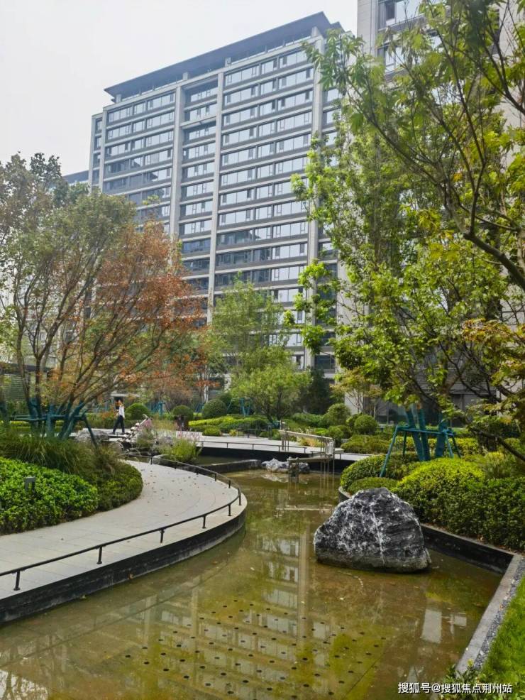 景观设计上,宣传用语是“内外双园、六境园林”,实际就是东西做了两处水系水景,中间大草坪,西侧有金属廊架,加上必有的一些功能区(会客休憩、儿童娱乐、塑胶跑道、消防空地等)。小区刚交房没几个月,园林绿化不是特别好,尤其是小区东侧和北侧,有点秃。但高端楼盘该有的都有,成树移植、多重立体、花卉灌木乔木搭配得当。