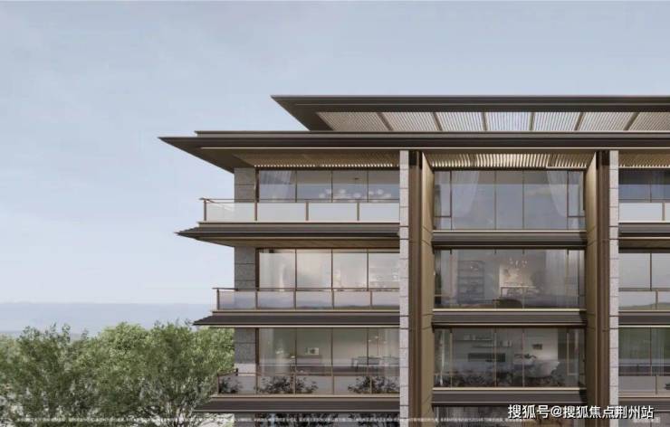 同频豪宅选材,大比重选用巨幕玻璃窗+铝板,并在建筑轮廓上搭配金属质感线条,实现约0.35-0.6的超高窗地比,将视觉界面拓展到「全画幅」,由此模糊了室内外空间的界限,更弱化了建筑和湖景之间的边界感。
