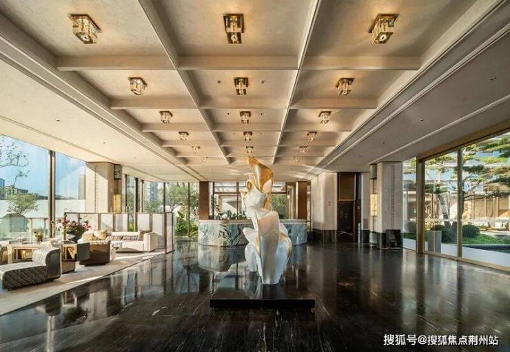 顺着风雨连廊,来到酒店式一楼大堂,中间设计了一个艺术雕塑。