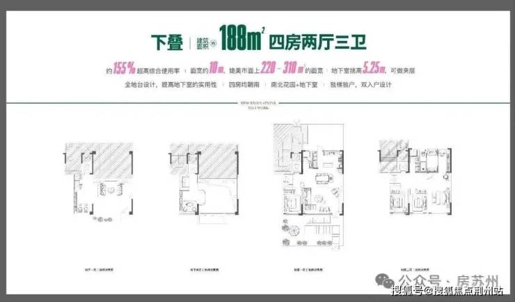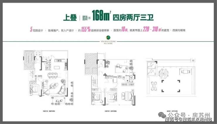 叠墅为4层真叠墅,均是独梯独户+双入户设计+约10米大面宽+约155%得房率的神户型!其中上叠更是实现了5花园设计!