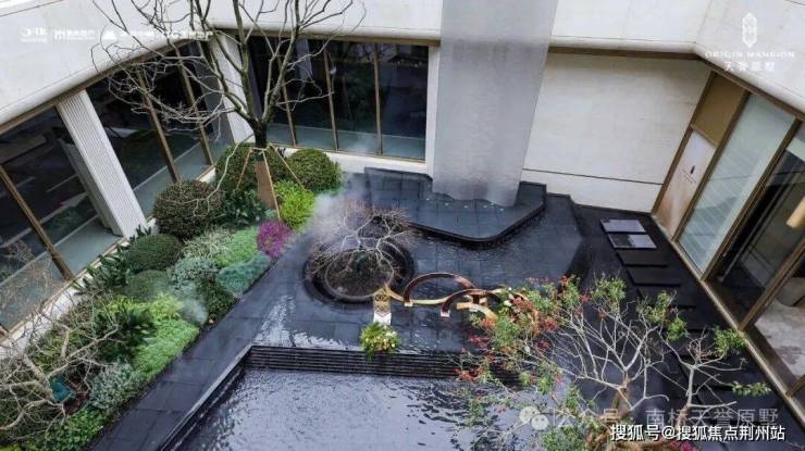往前信步,盛境渐次舒展,花园式多元景观徐徐展开。“大尺寸石材与细线条纹理”拼花而成的挑台,强化着空间的秩序与精致肌理。而最引人注目的,莫过于约10米落差的金属挂帘流水瀑布。水流如丝如缕,沿金属幕帘倾泻而下,与地面静水景无缝衔接,呼应庭院的珍贵,为源贵生活埋下伏笔。三时有花,四季见绿,每一次驻足,皆是一场与自然和艺术的亲密对话。