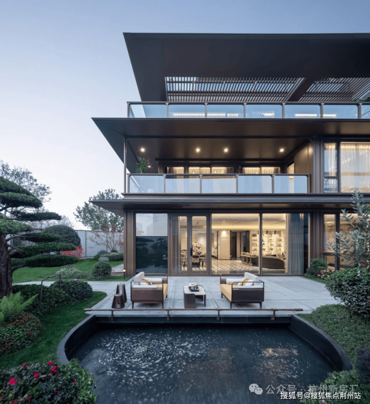 建筑立面上,鸣涛里一脉相承鸣湖里的设计风格,融合大面low-E玻璃、香槟金铝板、暖白色石材,勾勒灰色金属铝线条,搭配标志性的“飘檐云顶”,并转译“飞檐翘角”、“撺檐杆”、“版引檐”、“寻杖绞角造”等元素,既有宋式建筑的经典韵味又不失现代风格的灵动飘逸。