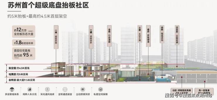 项目作为苏州首个超级底盘抬板社区,以约5米抬板叠加最高约4.5米首层架空,带来远超普通抬板社区的高度!实现纯粹人车分流、全明通风地库、进阶版无遮挡视野等多重优势。