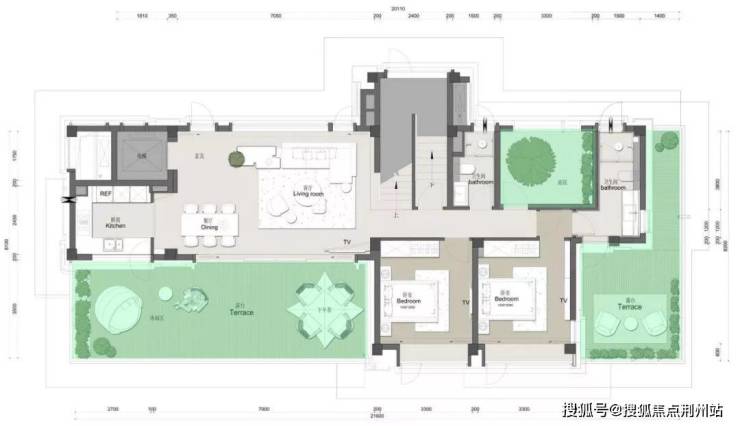 而“品字形”的上下叠墅为了避免这一问题,横跨两个下叠,为上叠提供了两个下叠全然没有的大开间。