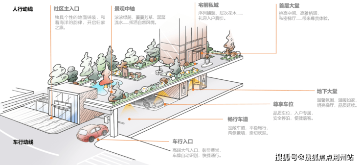 项目设计注重归家仪式感的营造,通过创新廊桥入口、空中廊桥与社区大堂的立体式动线规划,不仅增加了空间的层次感,也为居民带来了更为尊贵的归家体验。项目采用人车分流的方式,为业主规划了有序安全的归家路线。从社区入口到最终入户,人车各行其道,互不干扰,保障生活空间的私密和安静。