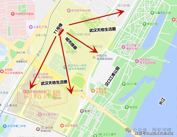 它的东南向即是延绵到汉口江滩的城市绿廊,西边即高低错落的社区中央园林,北向即市政公园(部分在建),毫不夸张的说,T1号楼东、西、北几乎被绿色环抱,在城市核心享真正的低密、松弛生活。