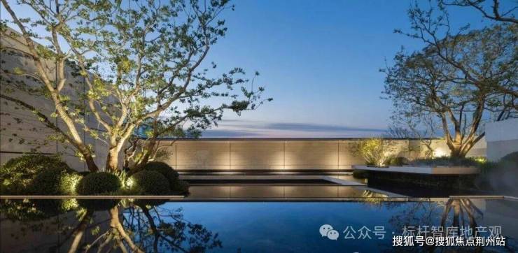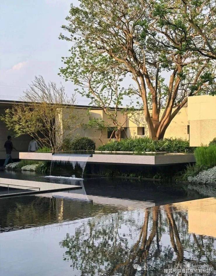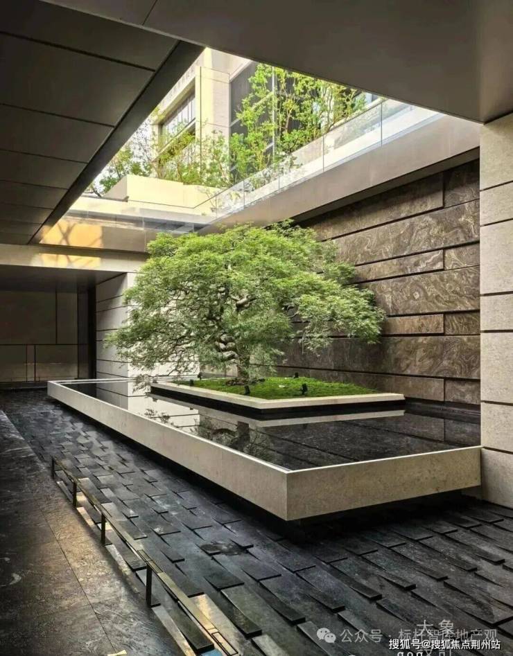 七株精挑细选的红果冬青,生长在层叠的悬浮水院之上。水底的幻彩蓝奢石倒映着天光云影,将杭州的立体山水浓缩进整片园林之中。