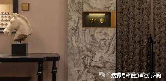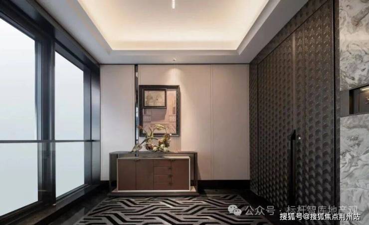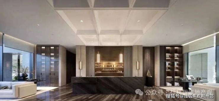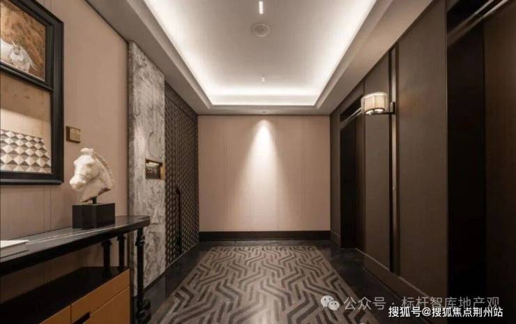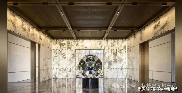 04会所设计元起观潮的归家大堂,被做成了极具东方意境的“金玉满堂”:定制的“缘起”艺术品、地面的静雅棕奢石、悬垂四周的水墨玉石墙......