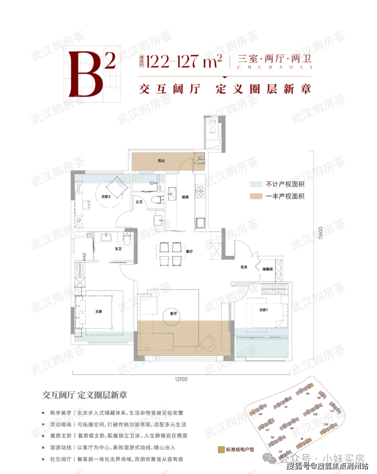 整个项目总建面约23万方,小区最高的楼栋26层、最低的仅9层,首开推出的是11、12号楼,含有建面约106、125、147㎡三种2T2户型。项目自建约5万方的开放式商街,住宅部分容积率2.85(含商业2.35),在江汉区核心地段里属于中低密舒适水平。物业公司是城建自有物业,物业费3.2元/㎡,预计2027年12月前交付。