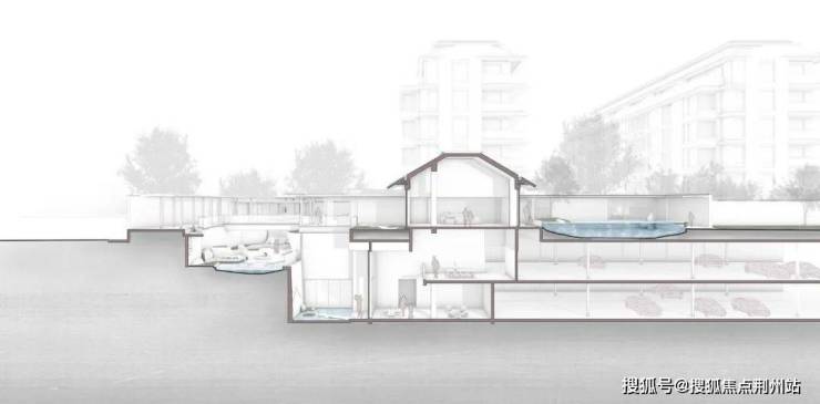 游廊以林木植被阻隔视线,通透而隐秘。中心庭院汲取寄畅园平面格局,形成“几面亭榭对池山”的空间意向。除了中轴折线的空间延伸,设计在垂直空间策略上,通过地下、地上空间的立体穿插,串联多层次空间形态,包容邻里交往、景观赏游、社区活动等多样生活场景,最大程度拓展了极为有限的土地资源。