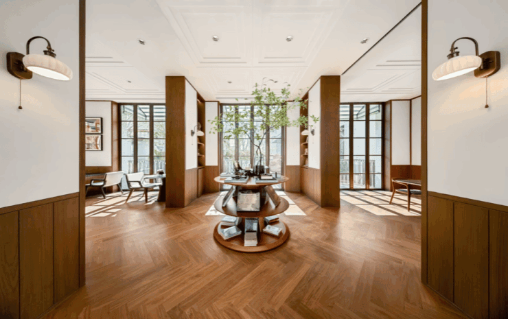 比如业主归家的一道门庭礼序:法式经典的轴线对称大门,柱廊排列搭配迎宾水景,顶部鎏金线条勾勒出典雅质感;室内大量拼花、拱券元素,它们共同构建出了一幅优雅的归家仪式感。