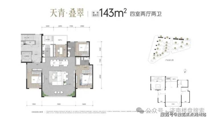 洋房约143㎡四室两厅两卫:私享入户电梯前厅;约13.7米超大南向面宽,巨幅落地窗,LDKB一体;约7米横厅连开敞式阳台,北向设备平台空间,约3.6米宽境主卧。