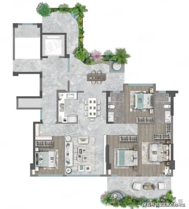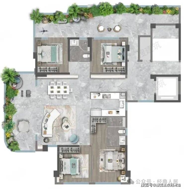 利用270°环绕景观打造错层全景露台,奇偶层露台错位,形成通高院落及多维度的城市上空森野谧境。