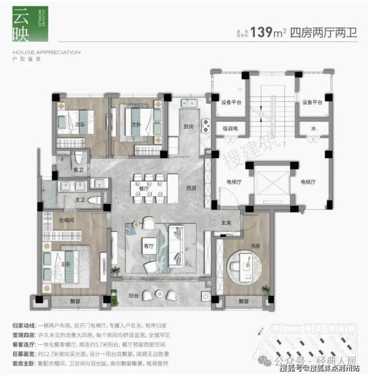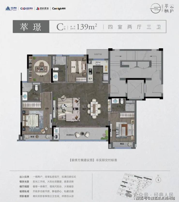 建筑面积约139㎡户型,四房三卫,整个户型三开间南,约13.8米的面宽,带来充沛的阳光。建筑面积约40㎡的一体式横厅,外连约6.8米全封闭阳台,将空间尺度做到了最大可能性的延伸。