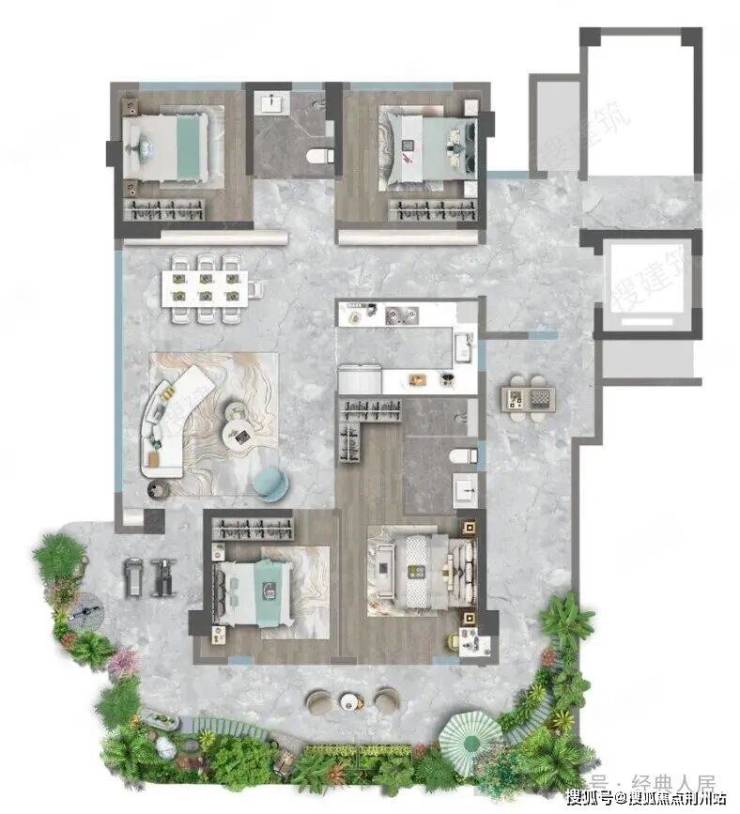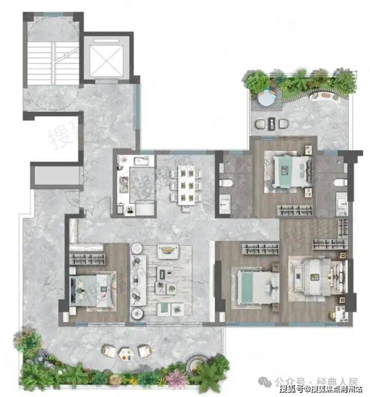 建面约139㎡分为中间户和边户,并且错层布置。每个户型都赠送有双层挑高的空中花园。其户型布局也十分合理,均为四房、LDKG一体化设计。