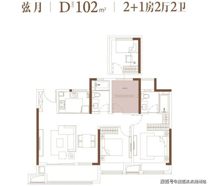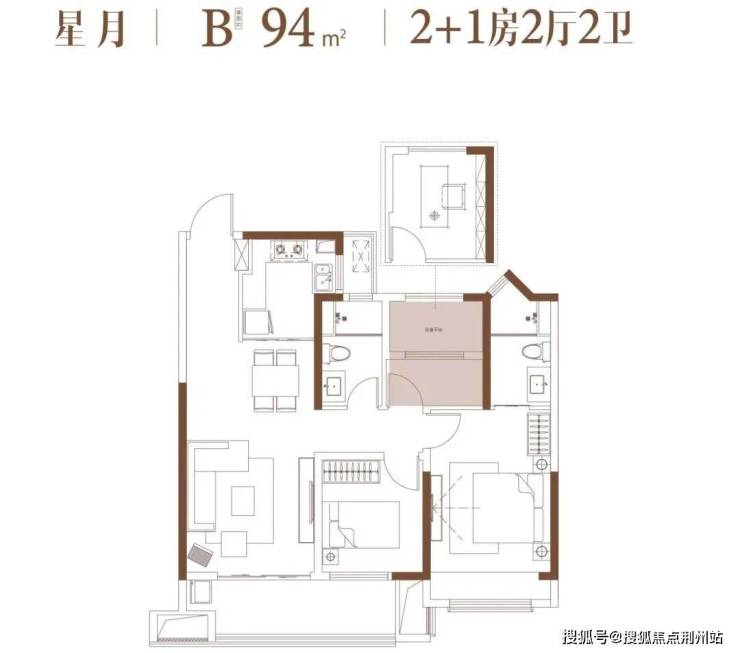 项目起步户型面积段,2+1房的布局可根据不同需求打造两房或三房,且主卧为套房式设计。
