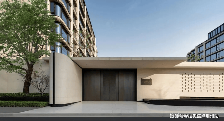 立面:石材与玻璃幕墙的合体奏乐,流动江岛的现代表达。立面材质是葡萄牙米黄暖色石材+质地温润的手工陶瓷砖+仿铜色铝板线条+整面玻璃,主大门墙面石材厚度35mm。