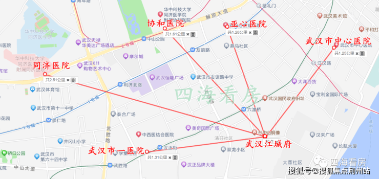 医疗上,项目拥有武汉市最牛的医疗资源天团,最近的是武汉市一医院和武汉市中心医院,都在6号线一条线上,距离协和、同济本院直线距离也在2公里左右。