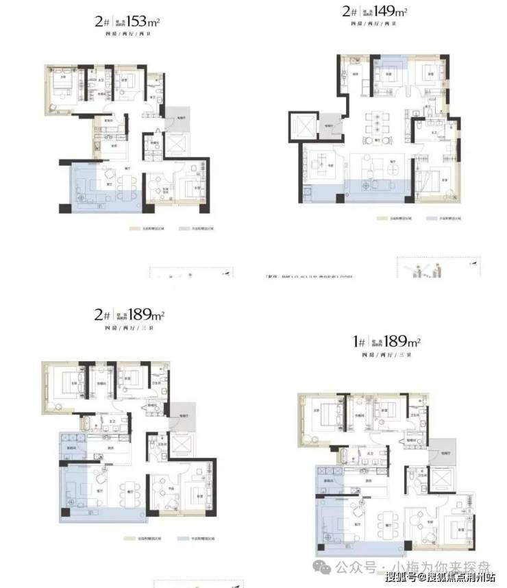 该项目一共三栋楼两个面积段,主力户型建面约146-189㎡,目前公示首开的面积为149㎡、153㎡和189㎡三个面积段四种户型。1号、2号楼东侧靠近和平大道为149平户型,西侧3-15层为153㎡;16层及以上为189㎡看江房源;3号楼为146㎡、153㎡和189㎡户型组合。户型图如下