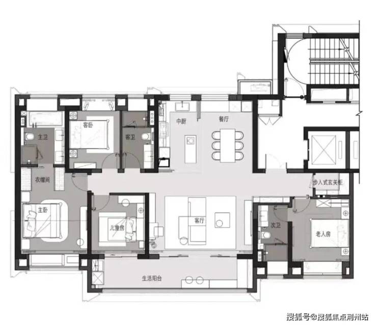 建面约180㎡四房两厅三卫户型