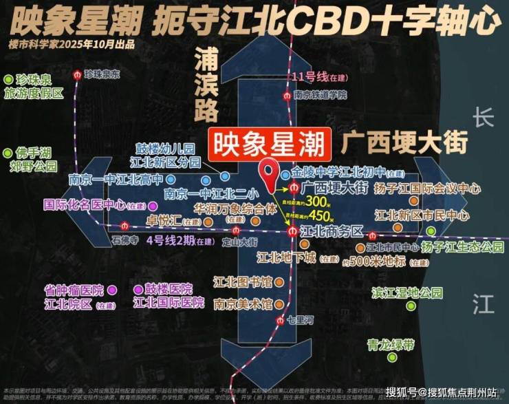 位于江北新区核中核,浦滨路和广西梗大街交汇处;紧邻【11号线】广西梗大街站(在建);近邻【4号线】江北商务区站(在建);距未来黄金主轴一一定山大街(预计2026年开街)直线距离仅约500m;