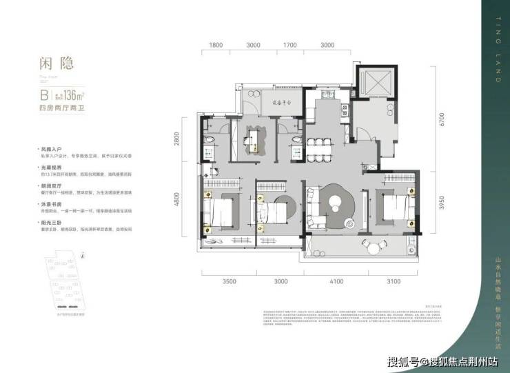 室内四房两厅两卫格局,南向面宽达13.7m,能更大限度地接纳阳光,营造温暖敞亮的居住环境。