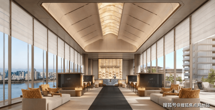 项目以一座高约16米、横跨超80米的双层式社区门庭作为归家仪式感的开篇,并在门庭二层打造一座“江景高端会所”。