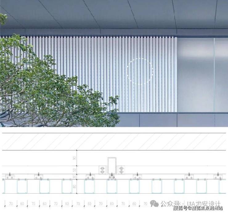 格栅端部的精致银灰色扣件巧妙地隐藏了结构缝隙,完善了立面美感。后期如需拆改,可通过卡钳式型材对顶部横向主龙骨进行安装口的遮蔽,确保施工过程的便捷性和安全性。