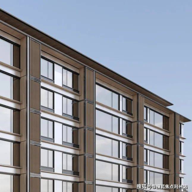 住宅建筑形体通过强调竖向框体语言进行体量分割,使建筑增加挺拔感,横向层间浅色线条彰显舒展性。