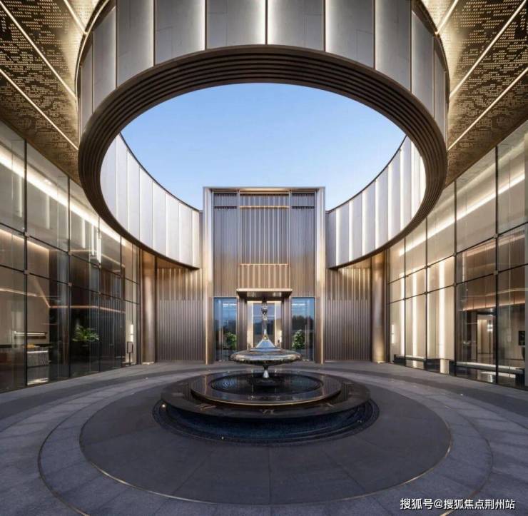 沈阳中海·天钻示范区主入口两翼的平易近人玻璃由曲面超白玻璃制成,高度为7.8米。中间圆形天花板的米色石材和金属格栅呈现出坚实与空旷的强烈对比,优雅而庄重。