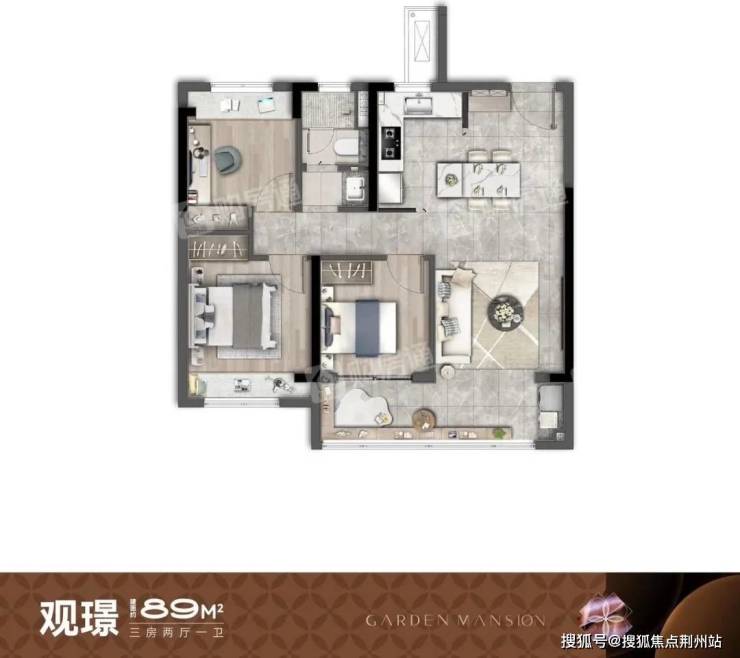 109平也是三房,不过是两卫设计,户型设计更偏向于“四叶草”,将静区卧室分布于四角,中间是客厅,动静分区合理,更适合两代/三代人居住。