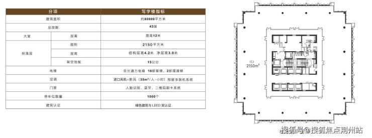 建筑高度230米,12米挑高大堂,9.6米柱跨,层高4.2米,18部电梯,标准层建面约2150㎡,获得绿色建筑与LEED金级双认证。