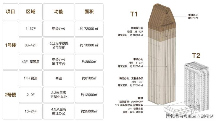 【产品概况】:项目由1栋5A甲级写字楼(T1)、1栋瞰江生态办公楼(T2)、少量裙楼商业组成,地上计容面积约为12.5万㎡,其中1号楼8.1万方,2号楼3.7万方,商业0.6万方。