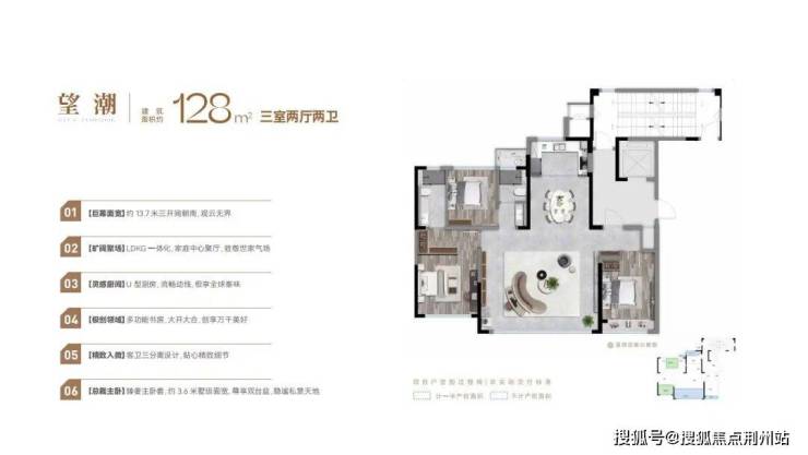 建面约128㎡:三室两厅两卫,2梯2户设计,双玄关入户,南向面宽约13.7米,U型厨房,主卧套房约3.6米面宽,主卫双台盆。