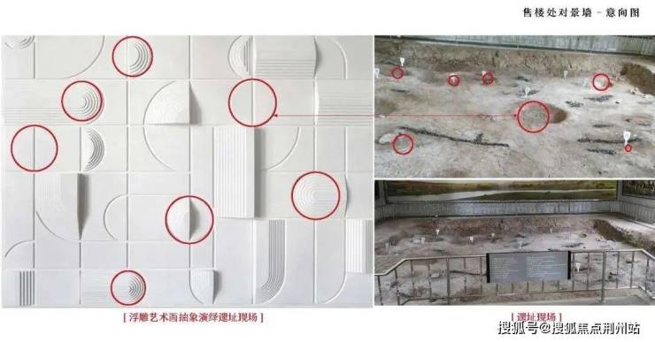 “源”景墙,灵感来源于新乐遗址的遗址现场,采用艺术画抽象演绎遗址现场。
